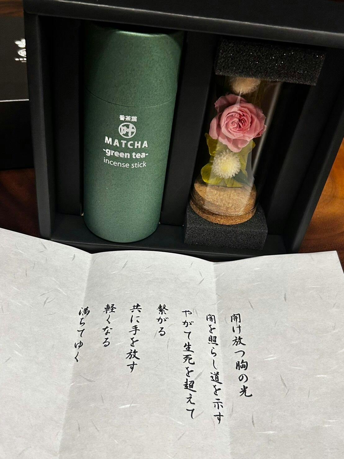 茶葉をテーマにしたお線香と長期保存できるボトルフラワーがセットになった進物線香です。