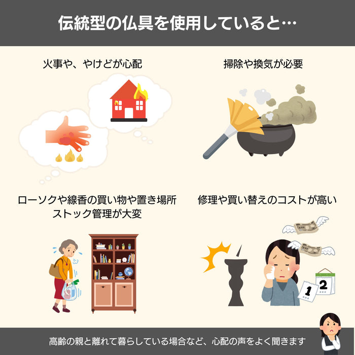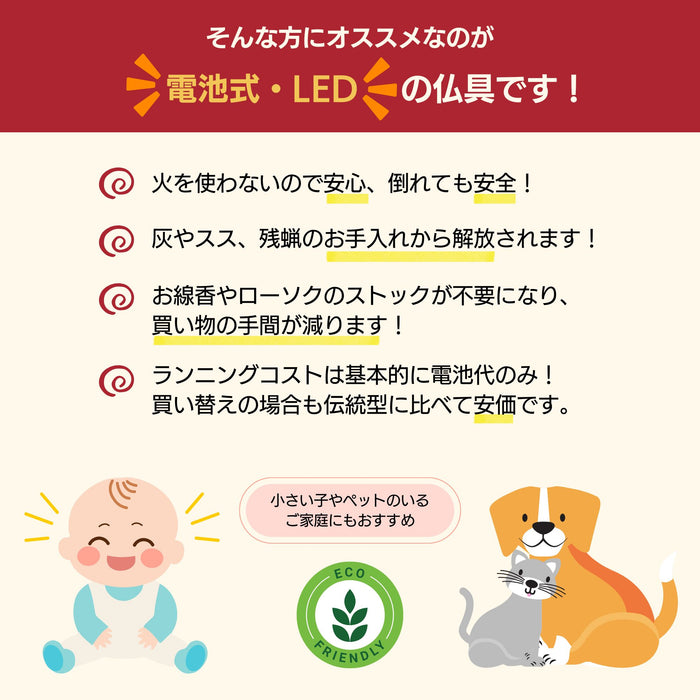 電池式でコード不要、火災の心配がございませんので、お子様やご年配の方がいるご家庭でも安心してお使いいただけます。